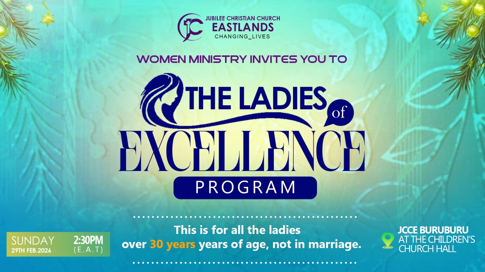 The Women Ministry warmly invites all ladies above 30 years who are not yet married to The Ladies of Excellence Program. Join us for an empowering afternoon designed to inspire growth, purpose, and excellence in every season of life. We look forward to hosting on Sunday 29th February at the Children’s Church Hall, from 2:30 PM (E.A.T).